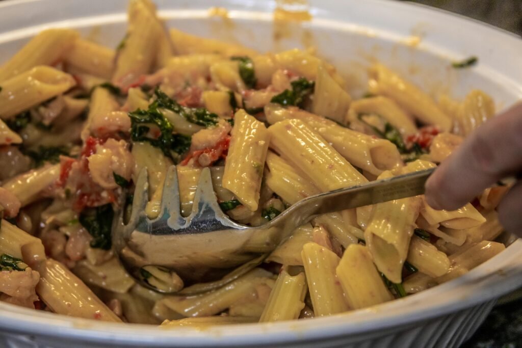 • Add cream cheese and ¼ cup pasta water to make a sauce.